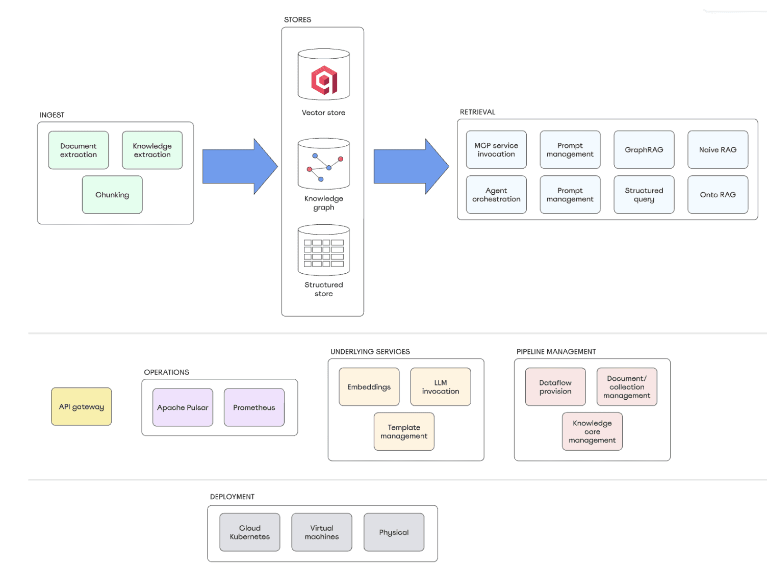 TrustGraph’s architecture is fully containerized, modular, and deployable across cloud, virtualized, or bare-metal environments.